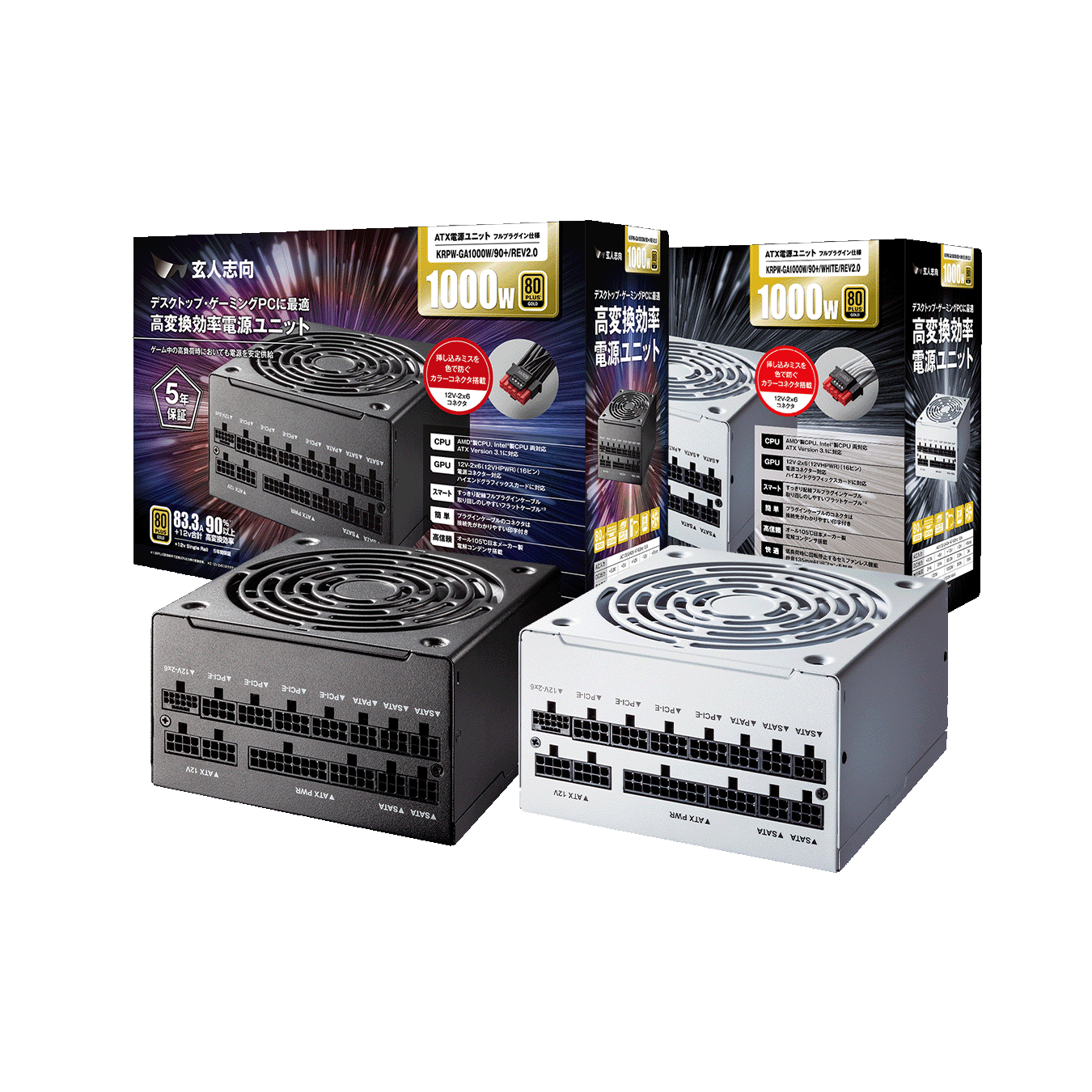 80PLUS GOLD認証 フラットケーブル&フルプラグイン ATX電源 容量:750W、850W、1000W カラー:ブラック、ホワイト