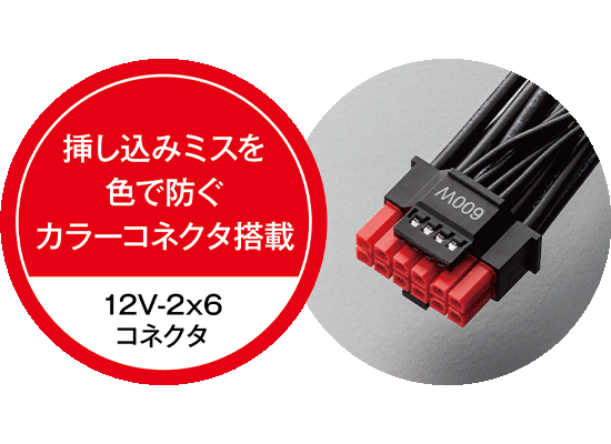 16ピン電源コネクターの挿し込みミスを防ぐカラーコネクターを採用